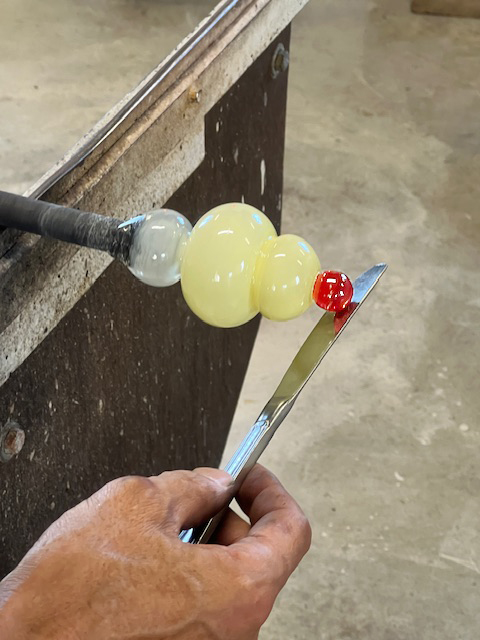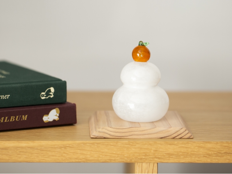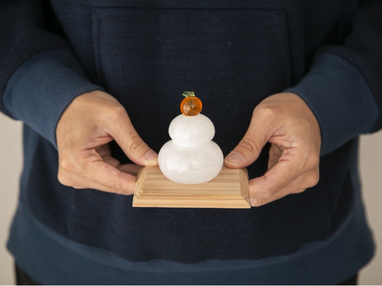 カンチャンさん、なんと4部屋分もお求め頂いたんですね。ありがとうございます。「お値段が高めかなと感じる」とのコメントを拝読して、カンチャンさんにお見せしたく、松野さんの制作シーンのお写真を取り寄せました。 松野さんの鏡餅は「吹きガラス」という伝統的な技法で制作されています。吹き竿(ふきざお)という道具を使って、息を吹き込みながら鏡餅のフォルムを作っていきます。下の写真は、最後にみかんを丸く整えているシーンです。 もうすぐカンチャンさんのご自宅の4部屋に鏡餅が飾られる時期ですね。型で大量生産されたガラス製品とは違って、手仕事ならではのゆらぎが、光を受けたときのやわらかな風合いとなって、ガラスという冷たい素材でありながら、どこか温かみを感じるオブジェとして、この鏡餅をお楽しみいただけるのではないかと思います。