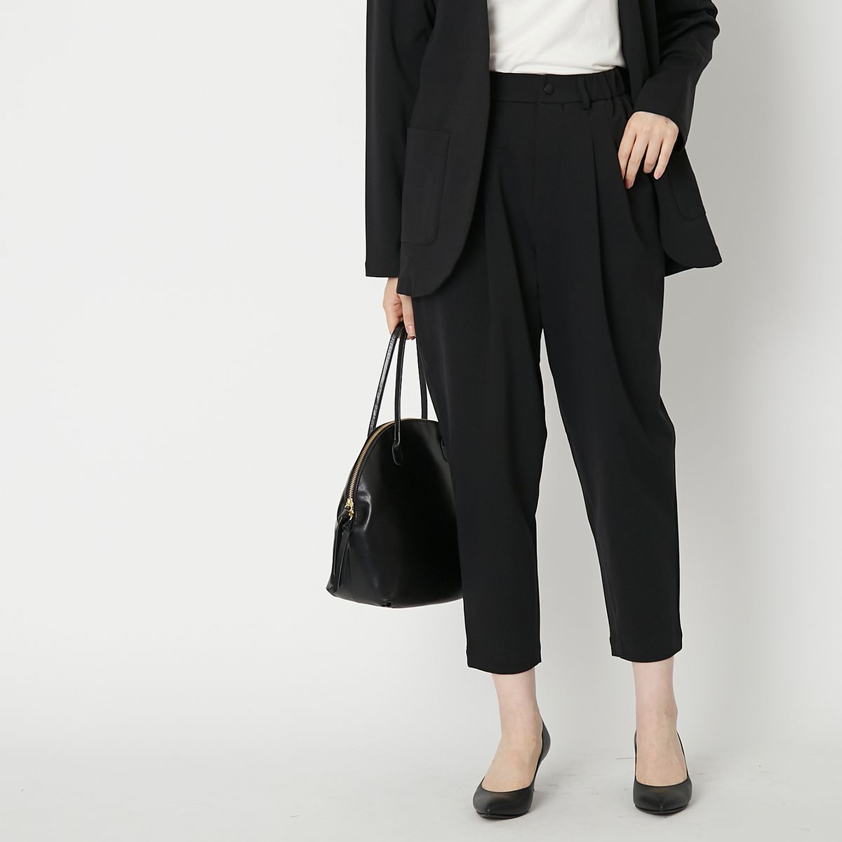 トップスは立体的で丸みを帯びたデザインなので、黒1色でものっぺりせず、すっきりとして見えるのが嬉しいポイントです。バスト下からドレープが広がるようなパターン設計のため、華やかな雰囲気を演出してくれます。また、テーパードシルエットのパンツは、ウエストがゴム仕様なので楽にはいていただけるのが魅力です。