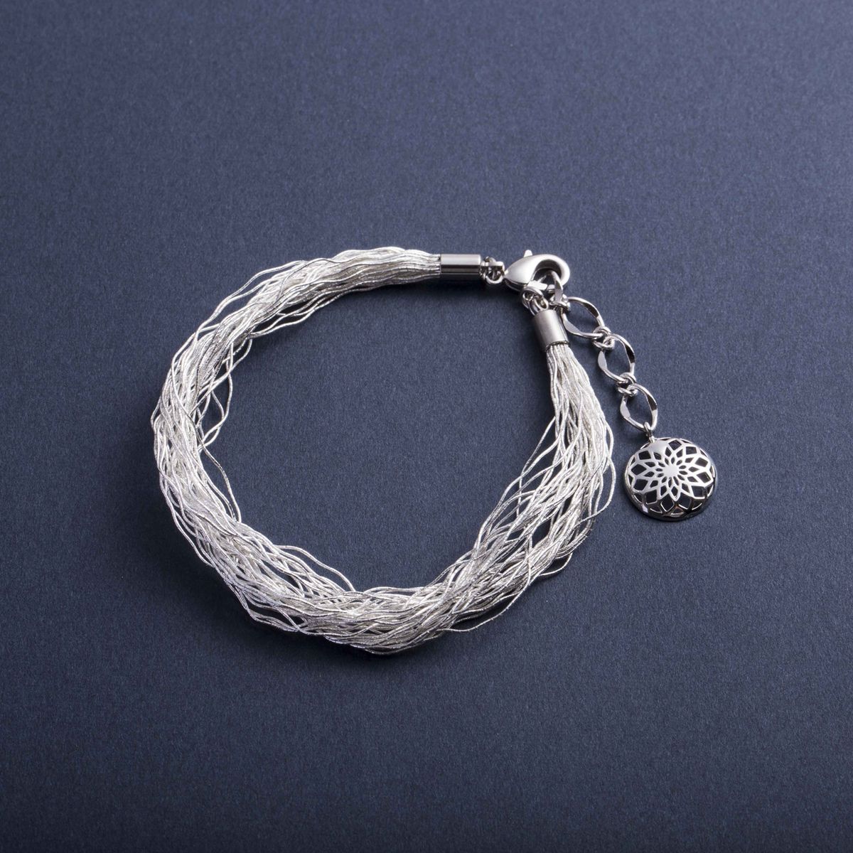 糸を使ったアクセサリーと聞くと強度が不安になるかもしれませんが、普段使いで糸が切れるようなことはありません。煌めく銀糸とオリジナルモチーフを掛け合わせたデザインは、伝統技術とモダンが絶妙にマッチした独特の雰囲気。箔から放たれる上品な光沢が、大人の女性の手元をやさしく彩ってくれます。