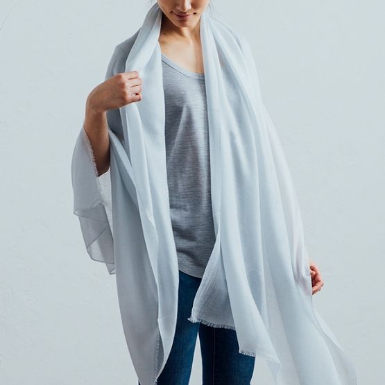 こちらはカシミヤのプロが作った、グラデーションが美しいストールです。カラーバリエーションは、フロストグレー、ディープブルー、マゼンタの3種類。いずれも同系色の濃淡でグラデーションが表現されており、巻き方によって色の見え方が変わります。軽くさっと巻くだけでも、色の見え方が均一にならず、こなれた印象に。