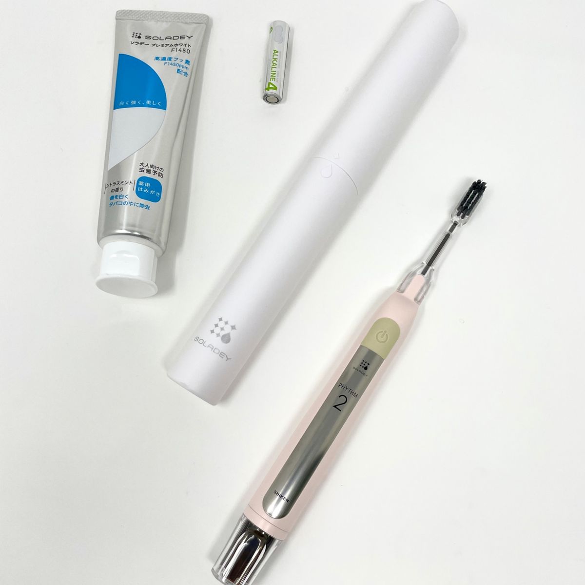 デイリーにはもちろん、旅行先でも使っていただきたい当店限定の電動歯ブラシと歯磨き剤のセットです。水だけで歯磨きできると人気の「ソラデーリズム2」は、電子の力で歯垢を剥がし、音波振動のブラッシングでそれを除去する画期的な一品。さらに電子のコーティングにより、歯への細菌の付着を防げる点も魅力です。