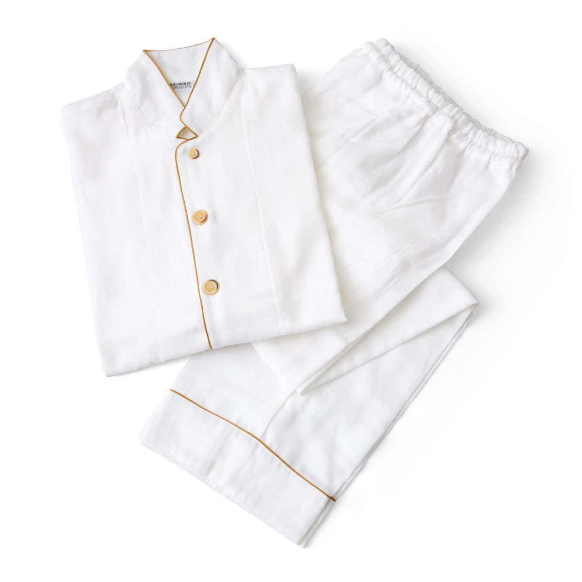 大正14年に京都で創業した「大東寝具工業」が、昔ながらの製法で作り上げるガーゼパジャマです。化学薬品を使わずに、和晒釜で4日間かけて不純物を取り除く京和晒綿紗(きょうわさらし めんしゃ)は、洗うほどにふっくら感がアップ。天然の沖縄産の澱粉糊で糊付けをしており、敏感肌の方も安心して着用いただけます。