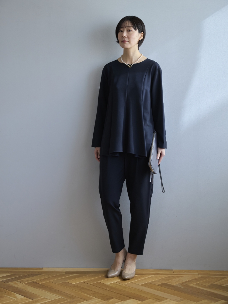 パンツはウエストがゴム仕立て、ヒップから太ももにかけてはゆとりがあり、裾に向かって細くなっているので、らくちんですがとてもすっきり見えます。