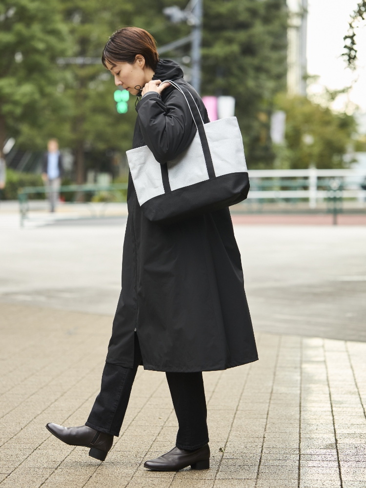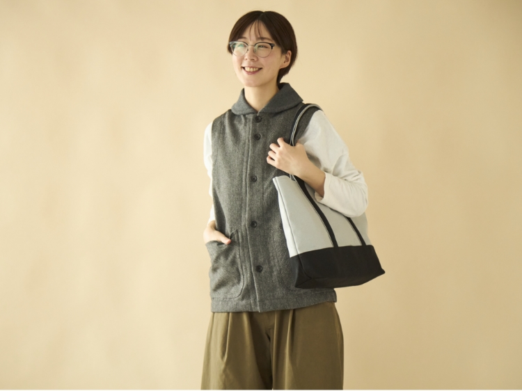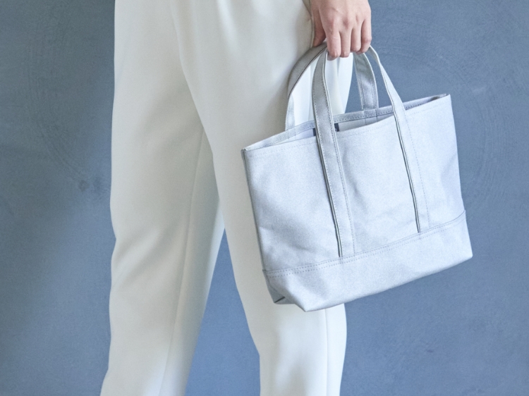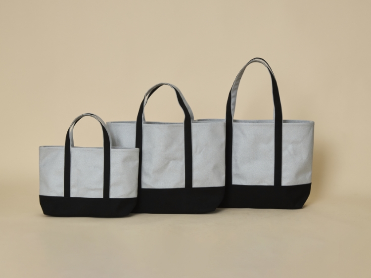 帆布に加工を施したメタリックな生地の雰囲気を生かしたいなと思い、ブラックを組み合わせたところ、帆布トートなのにスタイリッシュな印象になりました。