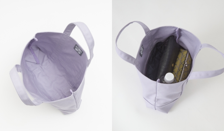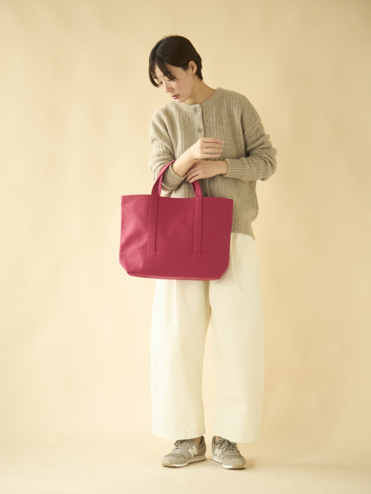 あえて内ポケットを付けず、シンプルなつくりですが、Sサイズは長財布やB5サイズのノート、500mlのペットボトルもちょうど良く収まります。普段のお出かけにはもちろん、お仕事の休憩中などに持ち歩くバッグとしても最適です。