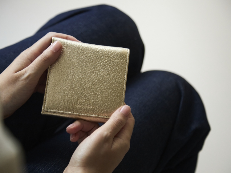 今回、新たにお取り扱いが始まったのは、インド山羊の革製の2つ折りのラメ財布です。山羊革は軽くてふかふかとした素材なので、牛革で作ったお財布よりも全体がふっくらとした仕上がりになっています。