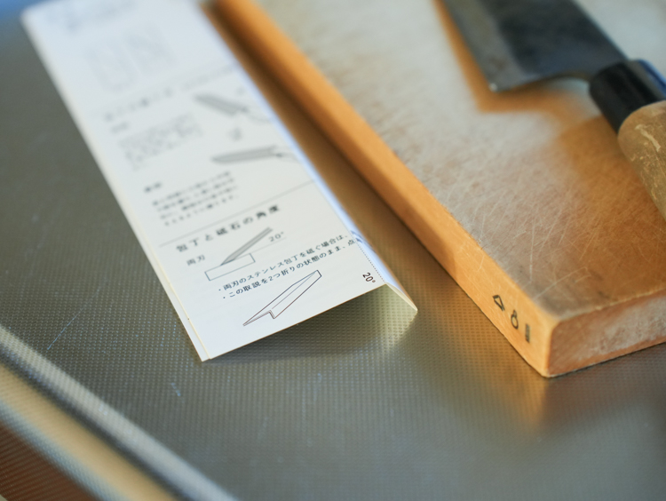 実際に研いでみると、こんなにわかりやすいガイドの線があるにも関わらず、包丁を往復させる度に少しづつガイドの角度からズレていきます。「角度が目に見えるように書いてあって、正解を意識しながら包丁を動かせる」のは、研ぎを身につける近道になりそうだなと思いました。