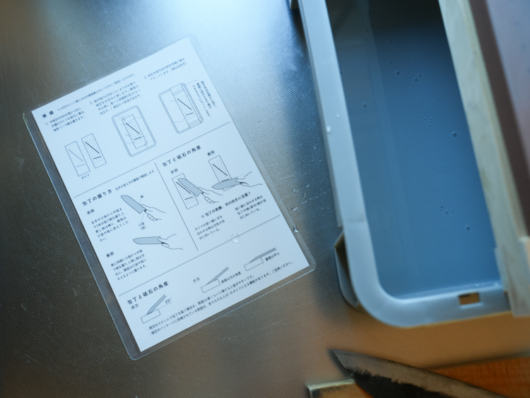 そして、地味に嬉しかったのが、手順書がラミネート加工されているところ。砥石のそばに置くと汚れるかも……という心配をすることなく、安心して手元に置いておけます。説明動画もあるので、文字だとわかりにくい点は動画を見て確認もできます。