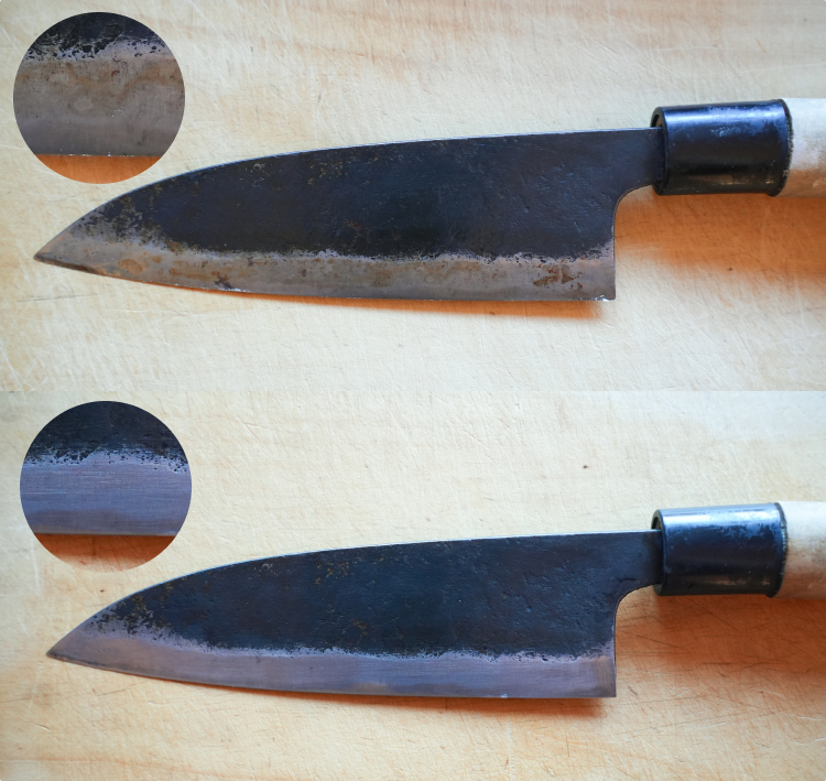 そんな話を聞いて、道具を揃え始めた時に迎えた鋼の包丁が一本あります。でも、ちゃんと使いこなせているかというと微妙なところ。水分を丁寧に拭いたりして気をつけていても、あっという間に錆びてしまいます。