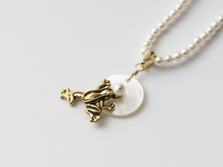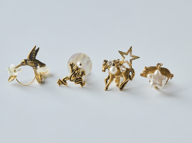 そんなつくり手に、当店限定のラッキーモチーフのアクセサリーを作って頂きました。使うほどに味わいの出るインポートの真鍮(ブラス)モチーフを中心に、パールやクリスタルを散りばめたコレクションです。