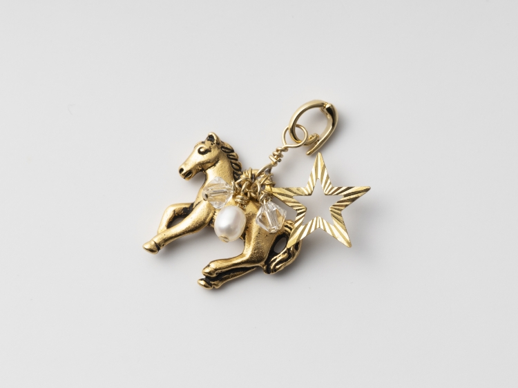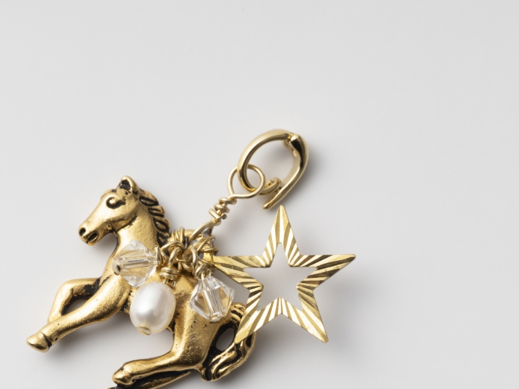 来年の干支、馬。前進・成功・飛躍の象徴とされ、馬のモチーフは目標に向かって進む人のお守りになります。そんなパワフルなイメージに合わせて星やクリスタル、パールを組み合わせたこちらは、身に着けるだけで元気が出そうなモチーフに仕上がりました。
