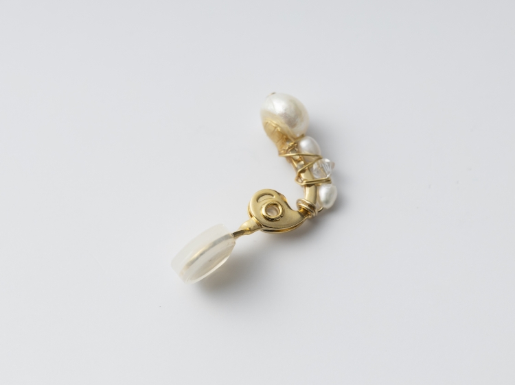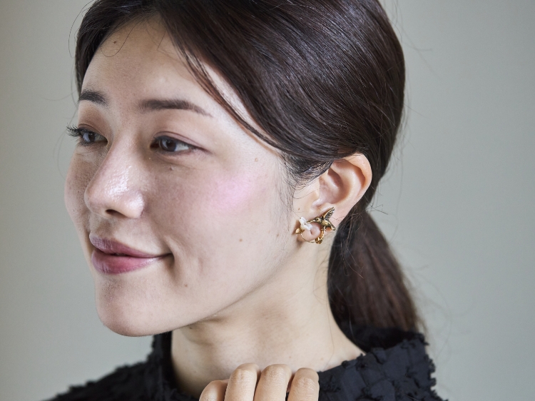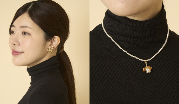 イヤリングは、ブラスモチーフに存在感があるので、片方にはシンプルなパールモチーフを合わせてアシンメトリーなデザインにしています。どれも各モチーフに合わせてパールのデザインを細かくアレンジしているのがポイント。手仕事ならではの細やかさです。