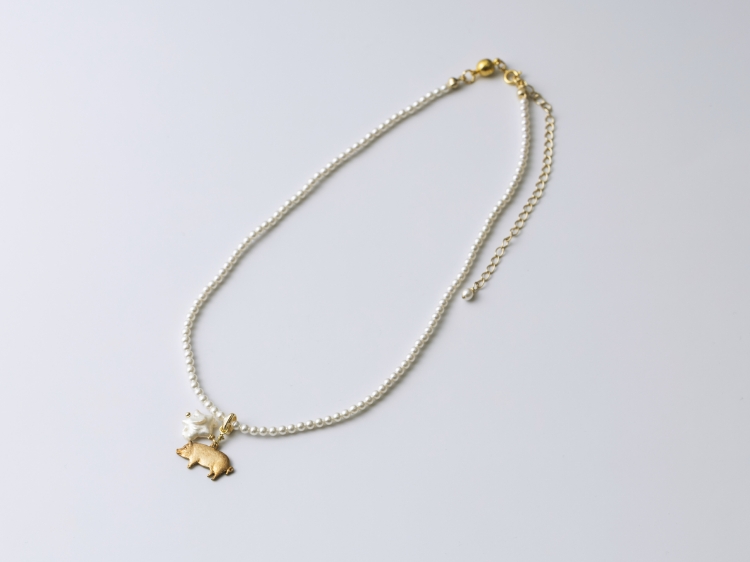 多産な豚は、世界中で幸運のシンボルとされていて、豊饒や繁栄の象徴です。また、見た目の可愛らしさも人気ですよね。どことなくユーモラスな豚には星のように見えるパール(個体差があります)を組み合わせています。「豚に真珠」ということわざを思い出してクスっと笑みがこぼれるモチーフです。