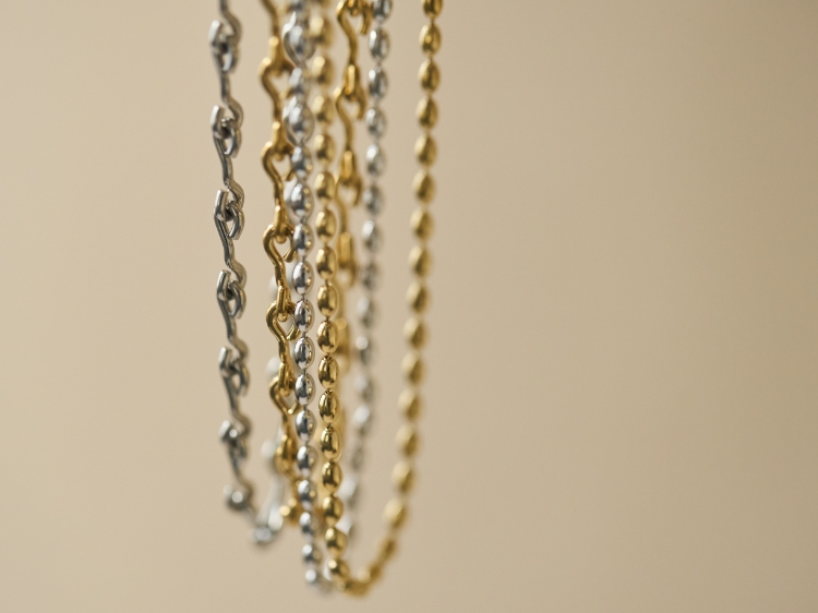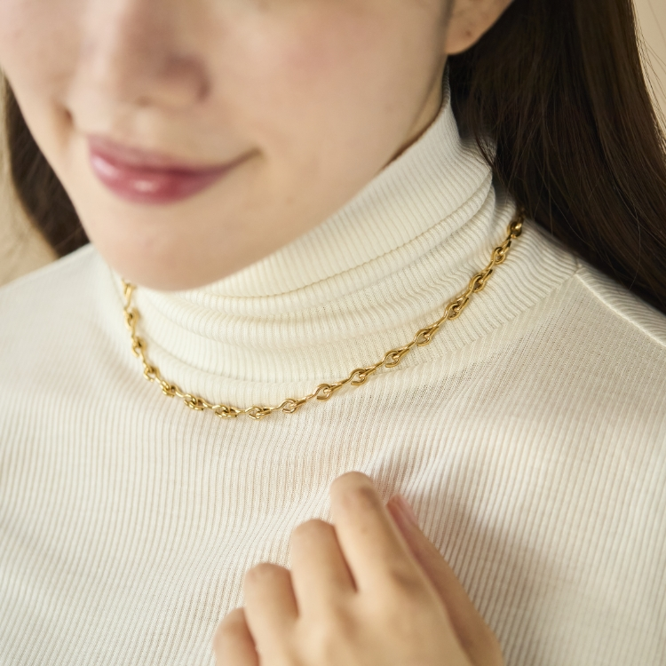 ぷっくりしたポテト型のパーツを連ねたネックレスは、女性らしさがありつつ、パールや石のネックレスなどに比べて仰々しくなりすぎず、軽やかな雰囲気です。