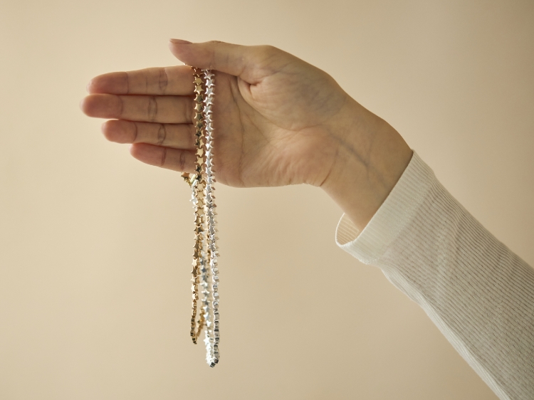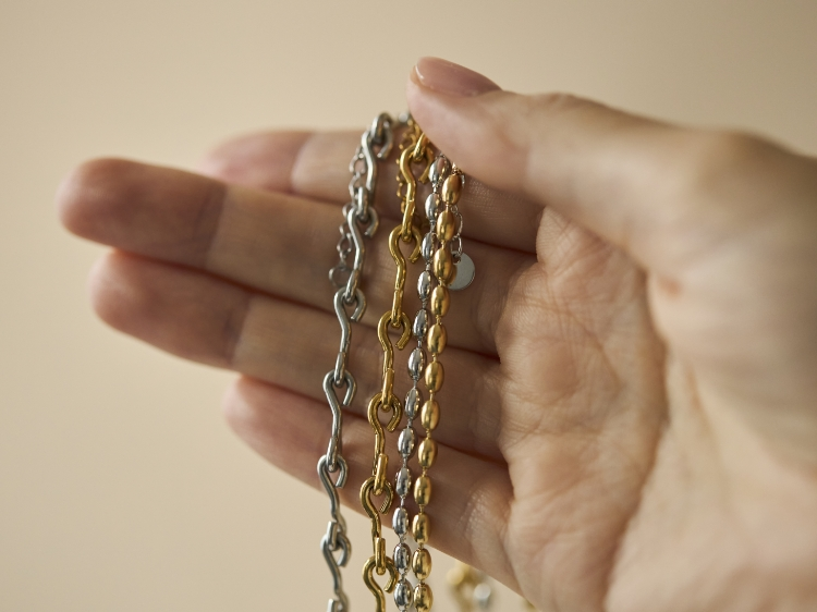 2つのネックレスをくっつけてロングネックレスにできるのもポイント。シルバーとゴールドを組み合わせて、華やかなロングネックレスとして身につけるのもおすすめです。