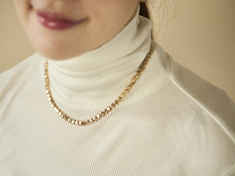 長さは40cm。首周りに沿い、首をすっきり見せてくれる長さです。チョーカーサイズでは首元が窮屈に感じる方、ロングタイプは合わせる洋服を選んでなかなかつけられない、と感じる方にぴったり。タートルネック・クルーネック・シャツなど、合わせるトップスを選びません。