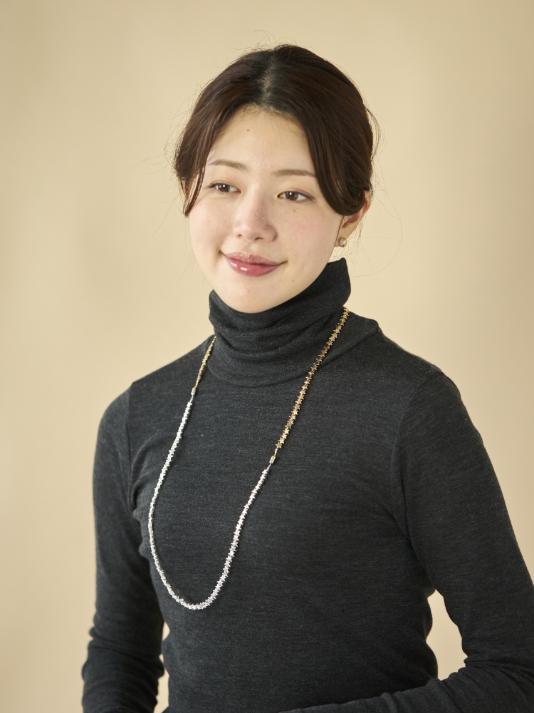 ヘマタイトとステンレス、2つの素材のネックレスはオンオフ問わず毎日のように活躍するデザインです。年末年始のお出かけにはもちろん、お仕事服のアクセントとして、春夏はシンプルなカットソーに添えて……と色々なコーディネートを楽しむことができます。あるとないとでは、顔色の明るさが驚くほど変わるので、是非取り入れていただきたいなと思います。