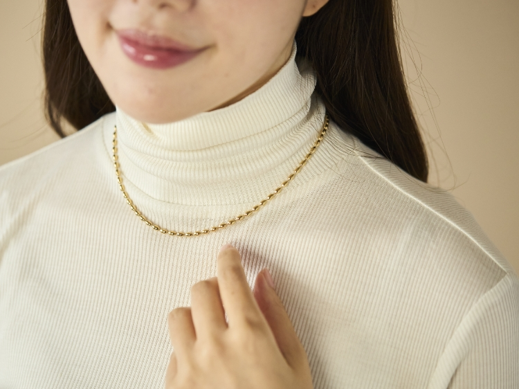 どちらのネックレスも、長さは40cm。首周りに沿い、首をすっきり見せてくれる長さです。チョーカーサイズでは首元が窮屈に感じる方、ロングタイプは合わせる洋服を選んでなかなかつけられない、と感じる方にぴったり。タートルネック・クルーネック・シャツなど、合わせるトップスを選びません。