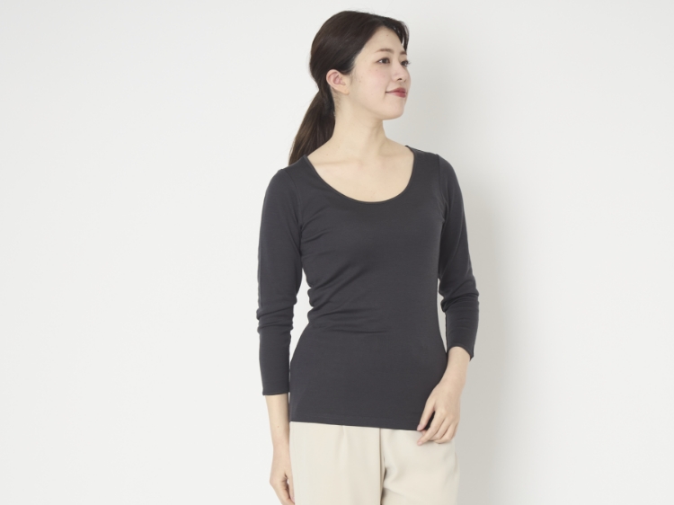 もう一つおすすめが。同じKilkaの「良く伸びて肌着見えしない長袖インナー」は、透け感がない程度に肉厚なので、シャツやブラウスなど薄手のトップスを着る日のインナーに最適です。