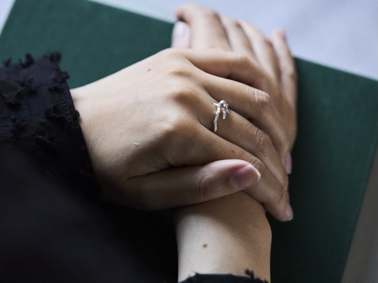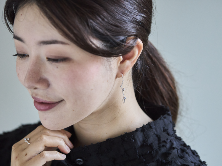 日本の冬景色の美しさにいつも胸を打たれるというichinoseさん。冬枯れの、葉を落とした木々を、凛とした姿で作品にしたいと誕生したモチーフがsnow branchです。リング、ピアス、イヤリングが揃っています。