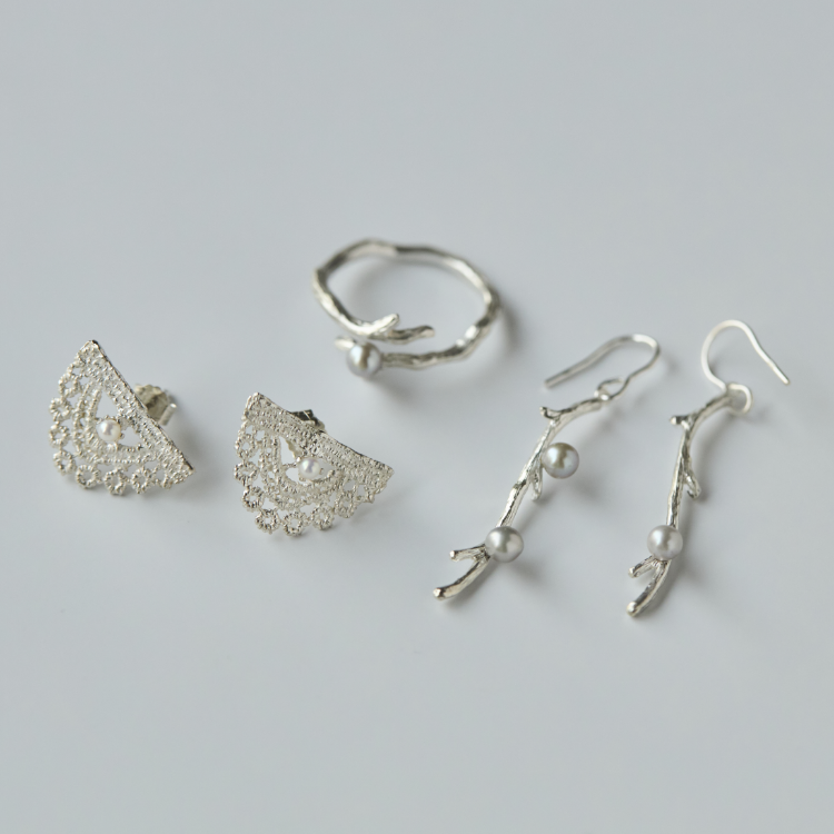 金属なのに冷たさを感じさせず、柔らかく優しい雰囲気が漂う。ichinose naomiさんの作り出すアクセサリーのそんなギャップに私は魅力を感じています。今回ご紹介する新作、snow branchシリーズは、冬空の下に佇む白銀の枝、降り積もる雪といった自然の美しさがシルバーとパールで表現されています。
