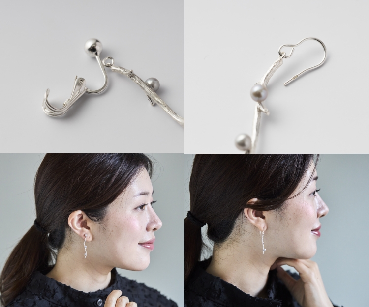 ピアスとイヤリングの2タイプをご用意しています。ピアスはフックタイプです。イヤリングはクリップタイプの金具を使用しているので、ネジバネ式に比べて着脱が簡単で痛くなりにくいと思います。