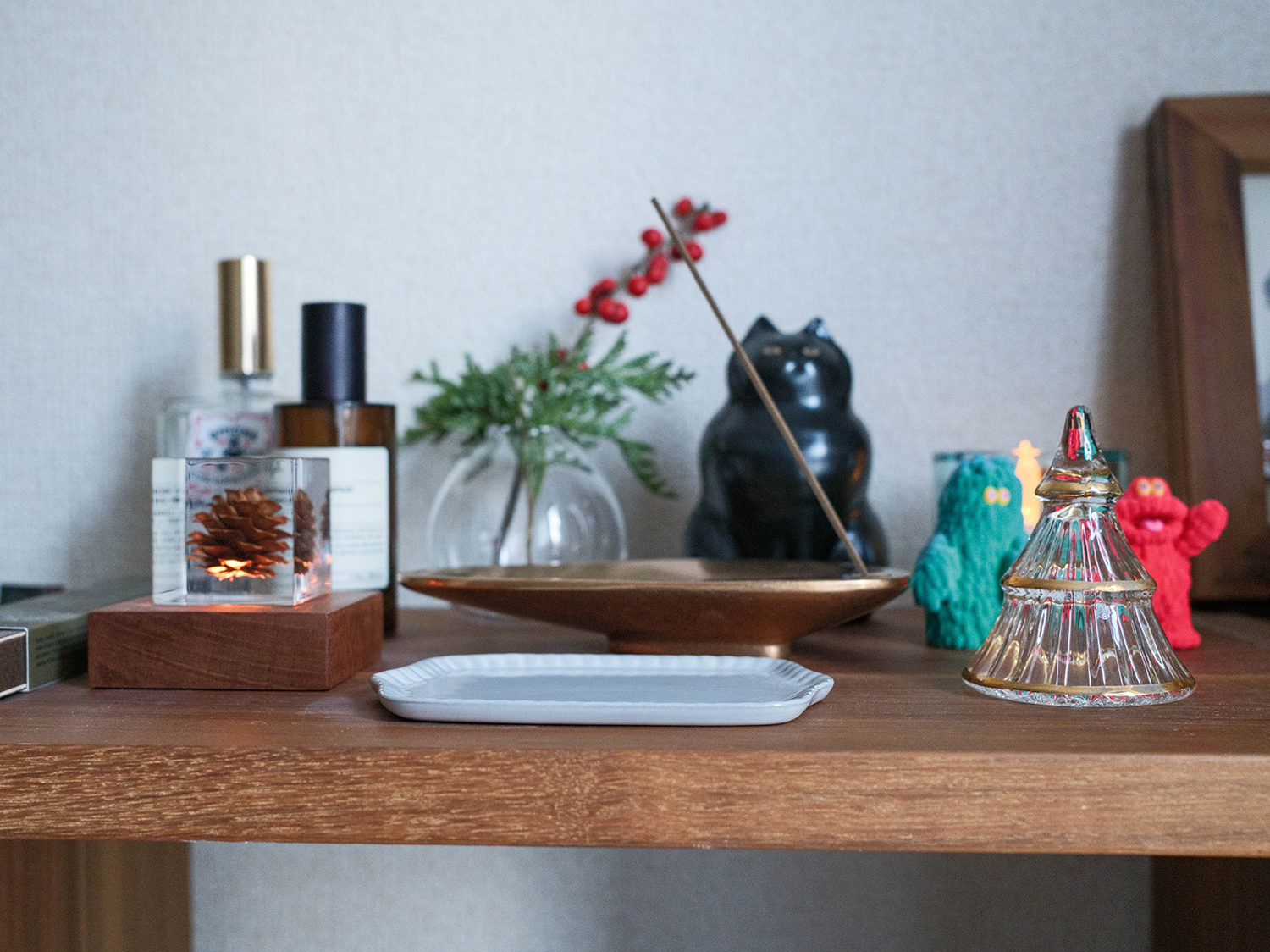オブジェの組み合わせは楽しい一方、デザインや素材によりハードルが高く感じることも多く、自分としてはあまり悩みたくないところ。こちらのクリスマスツリーは、色々な素材のオブジェと相性が良いので、小難しく考えず、置くだけで華やかにしてくれるのが嬉しいポイントです。クリスマスだけでなく、お正月や節句など、これからのシーズンでの組み合わせが今から楽しみです。