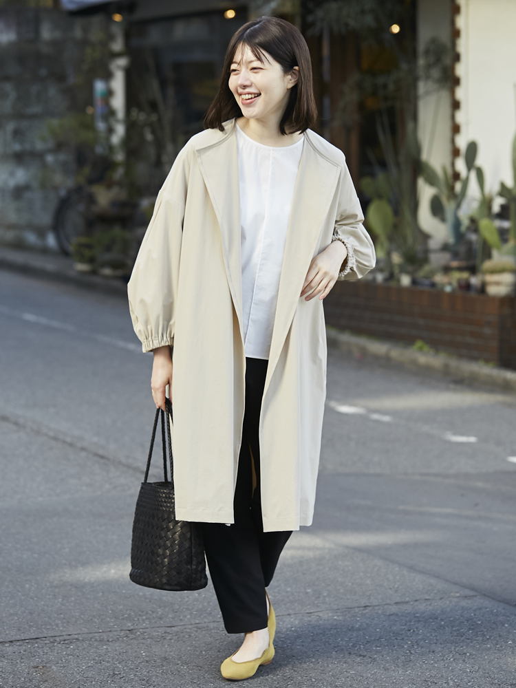 季節の変わり目に、とりあえず羽織っておけばこなれて見えるのがこのコート。適度なハリとやわらかさがあるので、自然な落ち感があり体のラインが美しく見えます。
