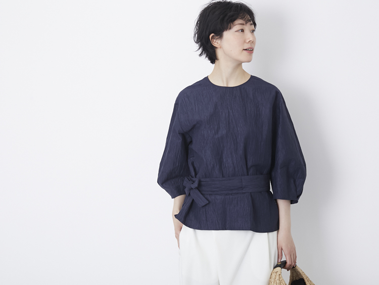 1枚で着てもジャケットを着ているようなきちんした印象に見えるブラウス。Aライン型でゆったりとしていますが、フロントにハギを入れて仕立てているので視覚的に縦長に。自然なドレープと落ち感がありつつも広がりすぎないので着ぶくれして見えないのが嬉しいところです。お仕事や学校行事などにも重宝する一着です。