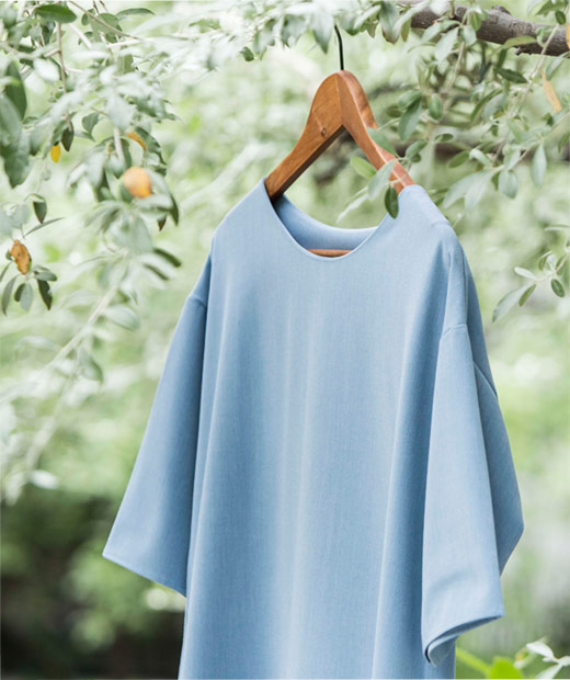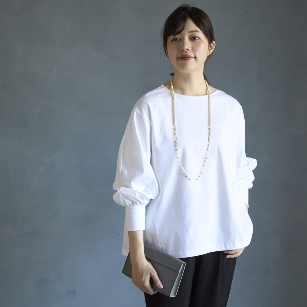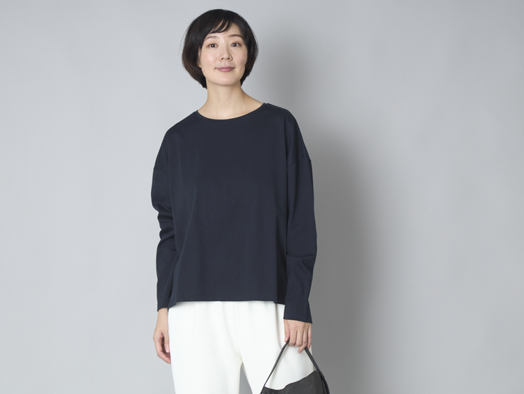 ロンTを着て「あ、何か残念」と感じるのは、フィットしたシルエットであらわになってしまう、体のライン。二の腕や背中、腰回りが想像以上に際立って、一枚で着ることに抵抗を感じてしまうこともありますよね。こちらは身幅はゆったり、ヒップや腰回りを程よくカバーする着丈、胸元の露出を抑えつつ、窮屈にならない襟ぐりなど、大人女性に必要なデザインにこだわって作りました。