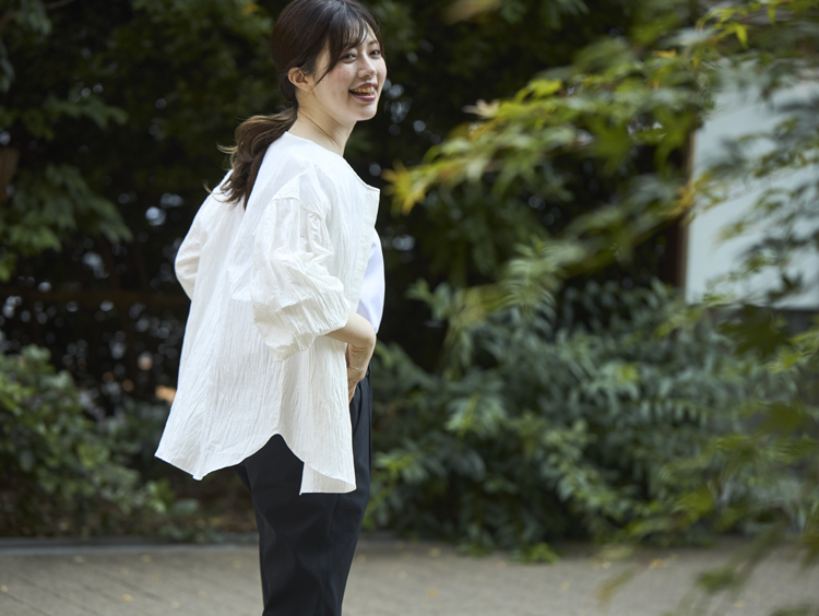 かつてスーツに定評のあるブランドで働いており、その後転職した会社ではジャケット着用が必須だったため、ほぼ毎日スーツを着て仕事をしていました。座ったりかがんだり、大きな荷物を抱えて移動したり。窮屈さとストレスを感じてたからこそ、体に余分な負担をかけないことにこだわって素材を探していた時に出会ったのが、こちらのストレッチポンチ生地です。