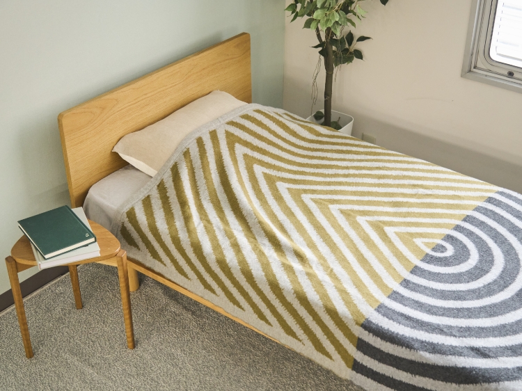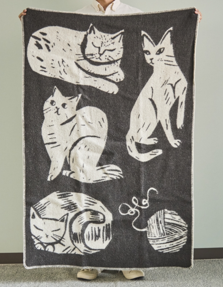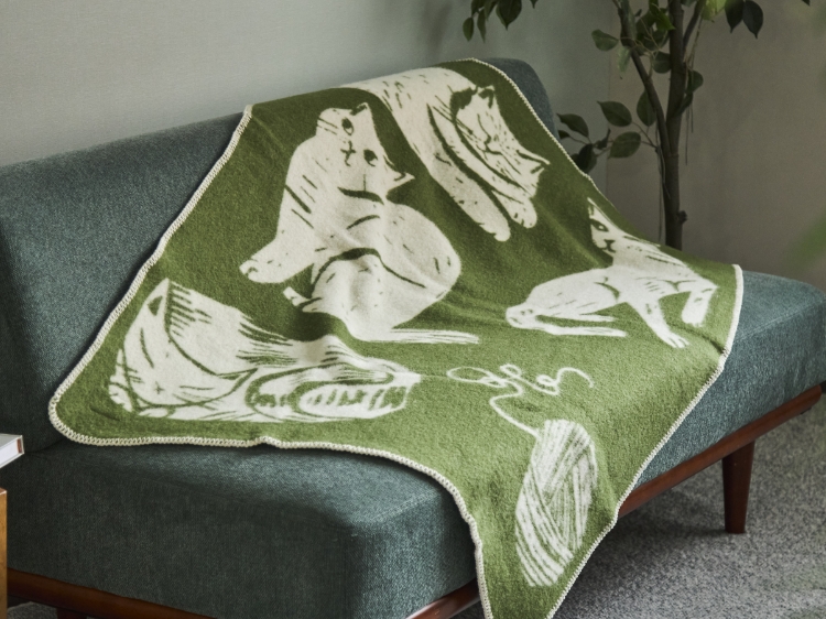 皆川明さんデザインの2柄は雄大な自然をモチーフにした柄で優しい色の組み合わせ。マッティ・ピックヤムサのデザインは愛らしい猫たちが描かれた癒される柄です。ベッドやソファに掛けるだけで、寝室やリビングの空間にアクセントを加えられます。