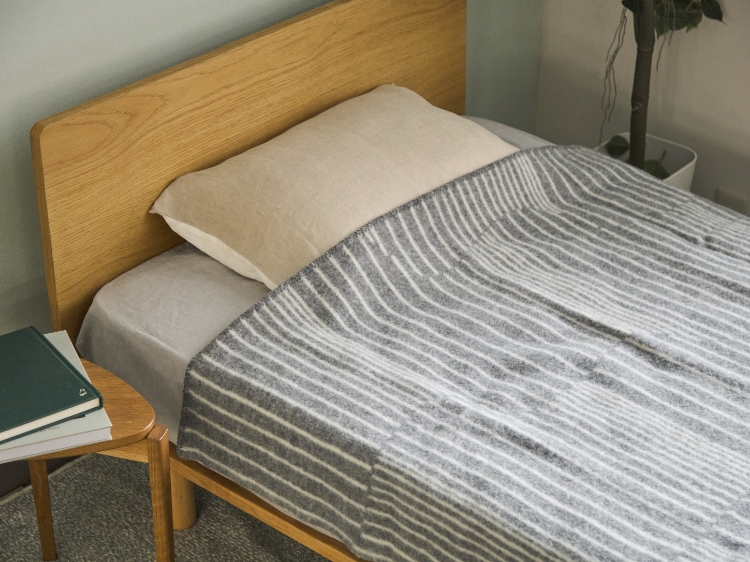 こちらはウールの中でも非常に細く柔らかな繊維を持つメリノウールを使っており、薄くて軽く、しなやかな風合いが持ち味です。ウールはチクチクするから苦手という方も少なくありませんが、そのような心配もご無用。直接お肌に触れても全くチクチクせず、柔らかくて気持ちが良いです。そのため、お肌が敏感な方や肌触りを重視する方にも、安心してお使いいただけます。サイズは毛布として使える約130×200cmです。