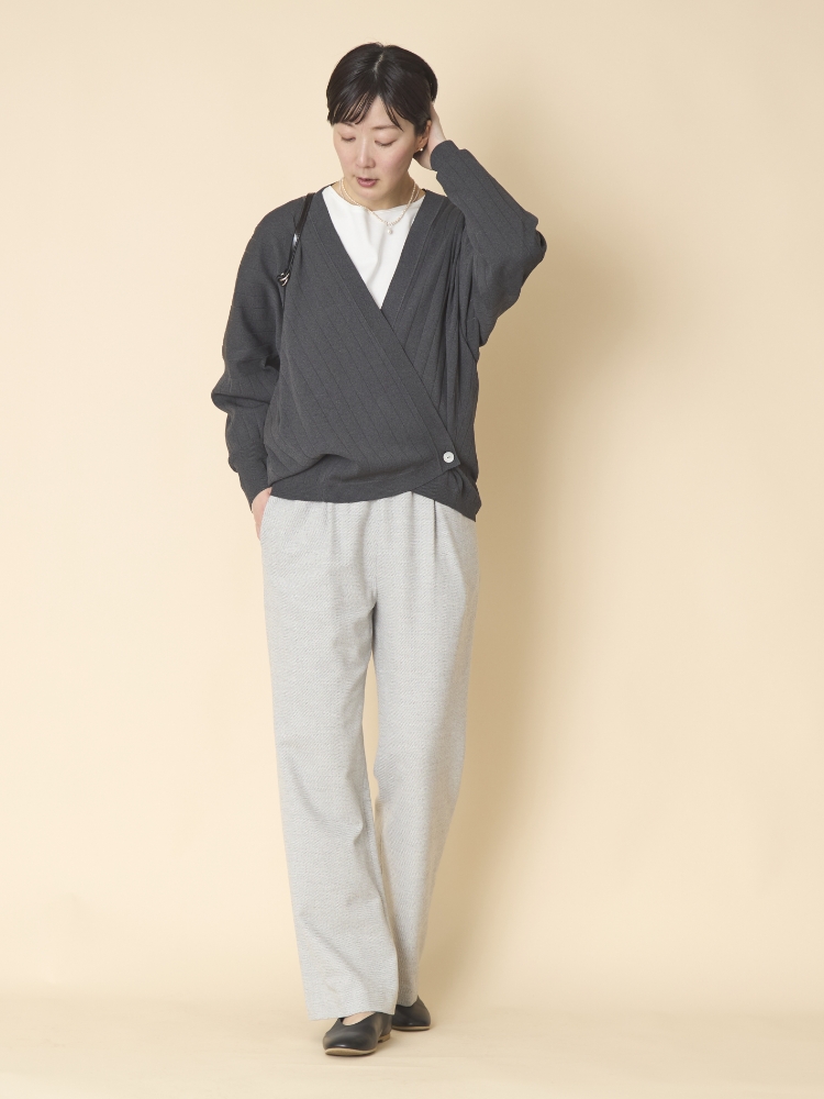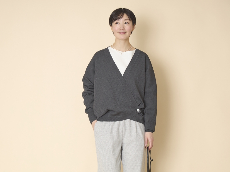 厚手で目の詰まったウールのニットは、重いものが多いですよね。そこにさらにアウターを重ねてバッグを持つと、冬のお出かけは体に負担がかかります。ですが、ハイテク素材は軽い!ウールのカーディガンは大体約350gが主流ですが、「ハイテクワイドリブボレロ」は約245gです。