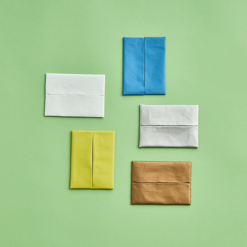 ポケットティッシュギリギリのサイズで作られているので、最初に装着するときはちょっと大変なのですが、使い始めるとこのフィット感がすごくいい。ケースの中でティッシュが泳がないし、取り出し口からティッシュがぴしっと出てくる。色展開が豊富なので、お相手のイメージカラーで選ぶこともできるし、モノトーン系の色は男性に間違いなく喜ばれます。柄もロゴもなくレザー見えするティッシュケースって、他になかなかないんですよね。