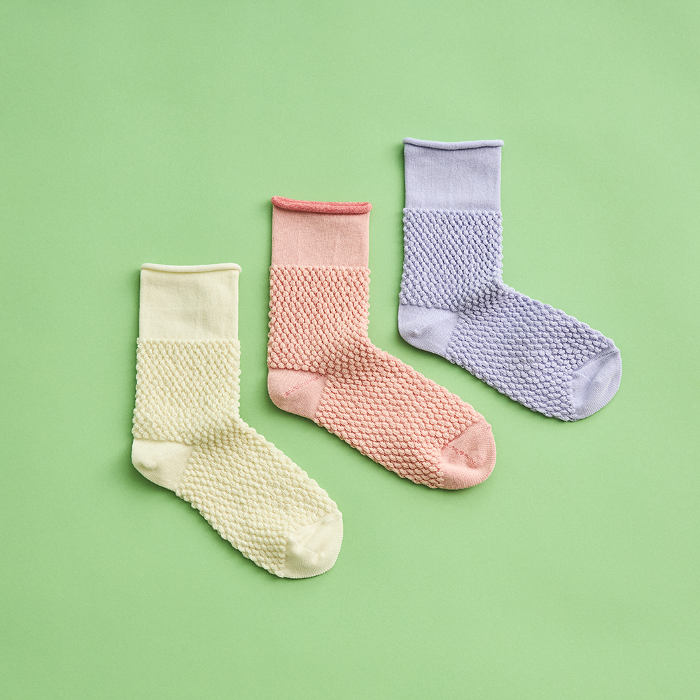「SHINSHUKU(シンシュク)」は、まずポコポコした見た目がかわいいでしょう?一般的な靴下より1.3倍編目が多く、ハニカム状になっているのが「ポコポコ」の正体。これが足全体をほわっと包んでくれるので、脱いだ後に靴下の跡がつかないんですよね。まさにリラックスのための靴下。
