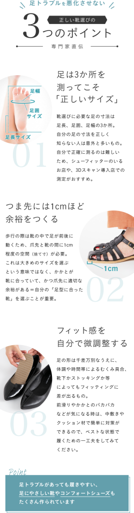 足トラブルを悪化させない靴選びのポイントはどこなのかをお聞きしたところ、ポイントは3つ。正しく自分のサイズを理解し、靴選びに生かすのがポイントなんですね。ところが6割の方が自分のサイズを勘違いしているのだと言います。