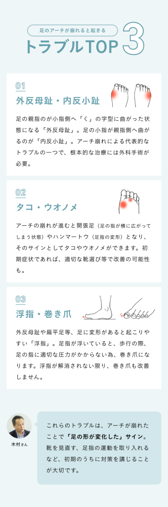 足トラブルの根本的な原因は「足のアーチが崩れる」ことから始まります。足のアーチが崩れる要因はいくつかありますが、代表的なのが「加齢」。足を支える筋力が低下することで、足底のアーチが崩れ、外反母趾やタコ、巻き爪など様々なトラブルが起こるのです。