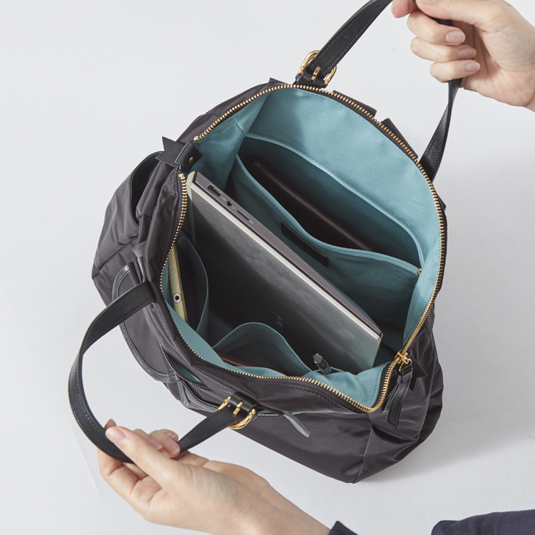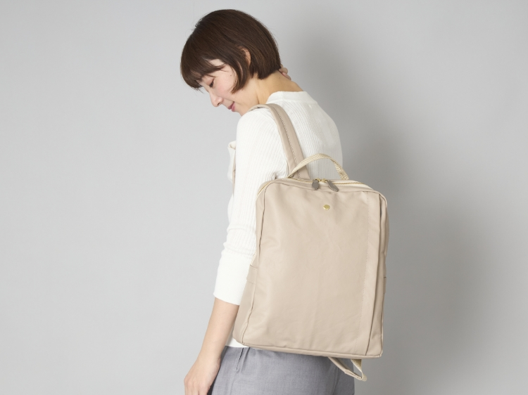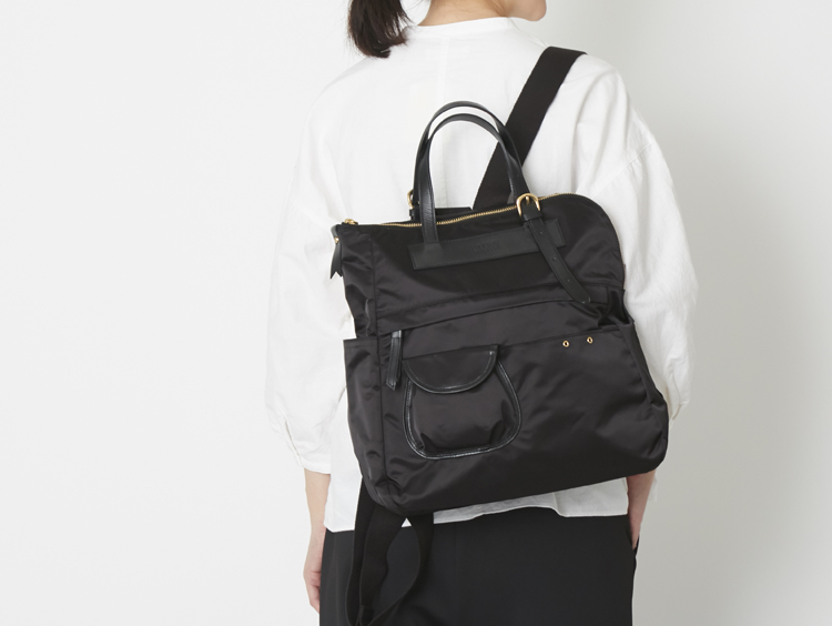リュックとトートバッグの2way仕様。「66ナイロン」というハリ、コシ、光沢のある素材が使われており、きれいめな装いとあわせても違和感がありません。撥水性があり、雨の日でも使いやすいことも魅力のひとつ。約550gと軽量ながら収納力抜群で、A4サイズのファイルや13インチのノートPCも入ります。