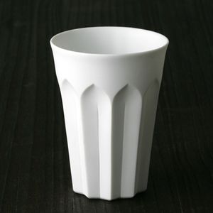 「プレス」シリーズは、昭和初期のプレスガラスのカットの美しさを、マットな磁器を使って再現。片手に収まる程度の小さなサイズの「プレスコップ S」は、スプーンレストとしても利用できます。