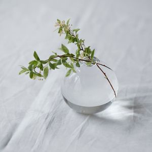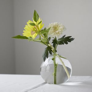 透明でシンプルな形なので脇役に徹して、主役のお花を引き立ててくれる。それでいて花器自体の佇まいも美しく、「存在感がないようである」というなんとも不思議な花器です。