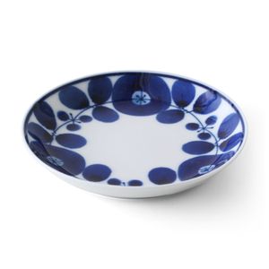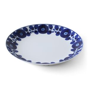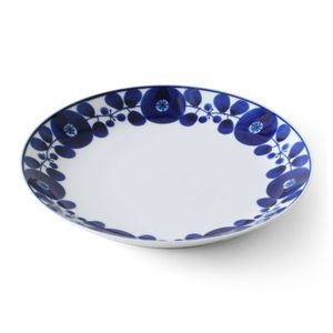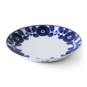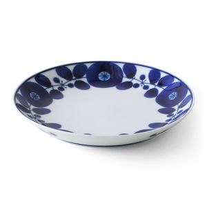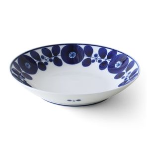 「BLOOM ブルーム フリーディッシュ リース」は瑠璃色の花柄が美しい、あたたかみのあるうつわ。どんな料理にもマッチしておいしそうに引き立てます。