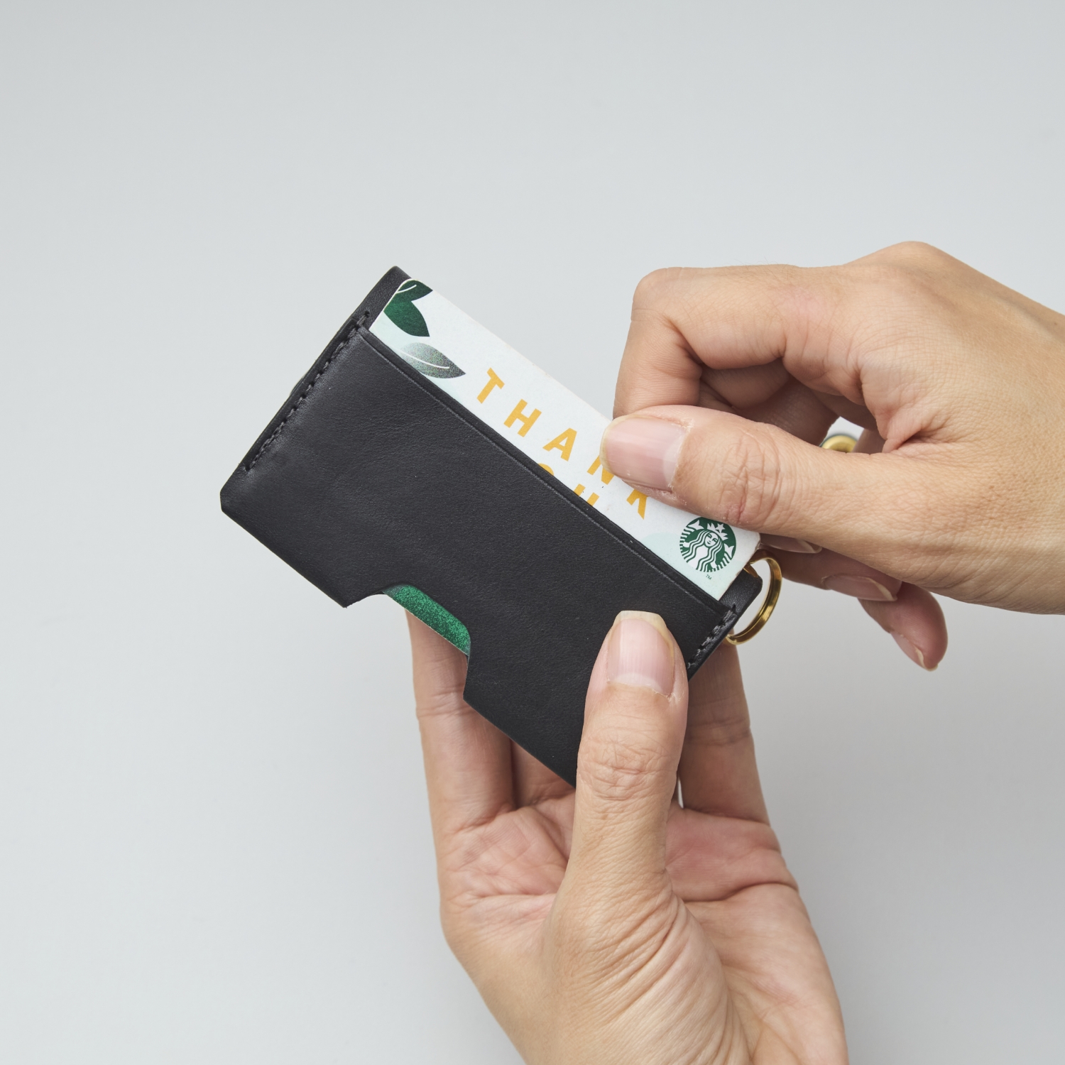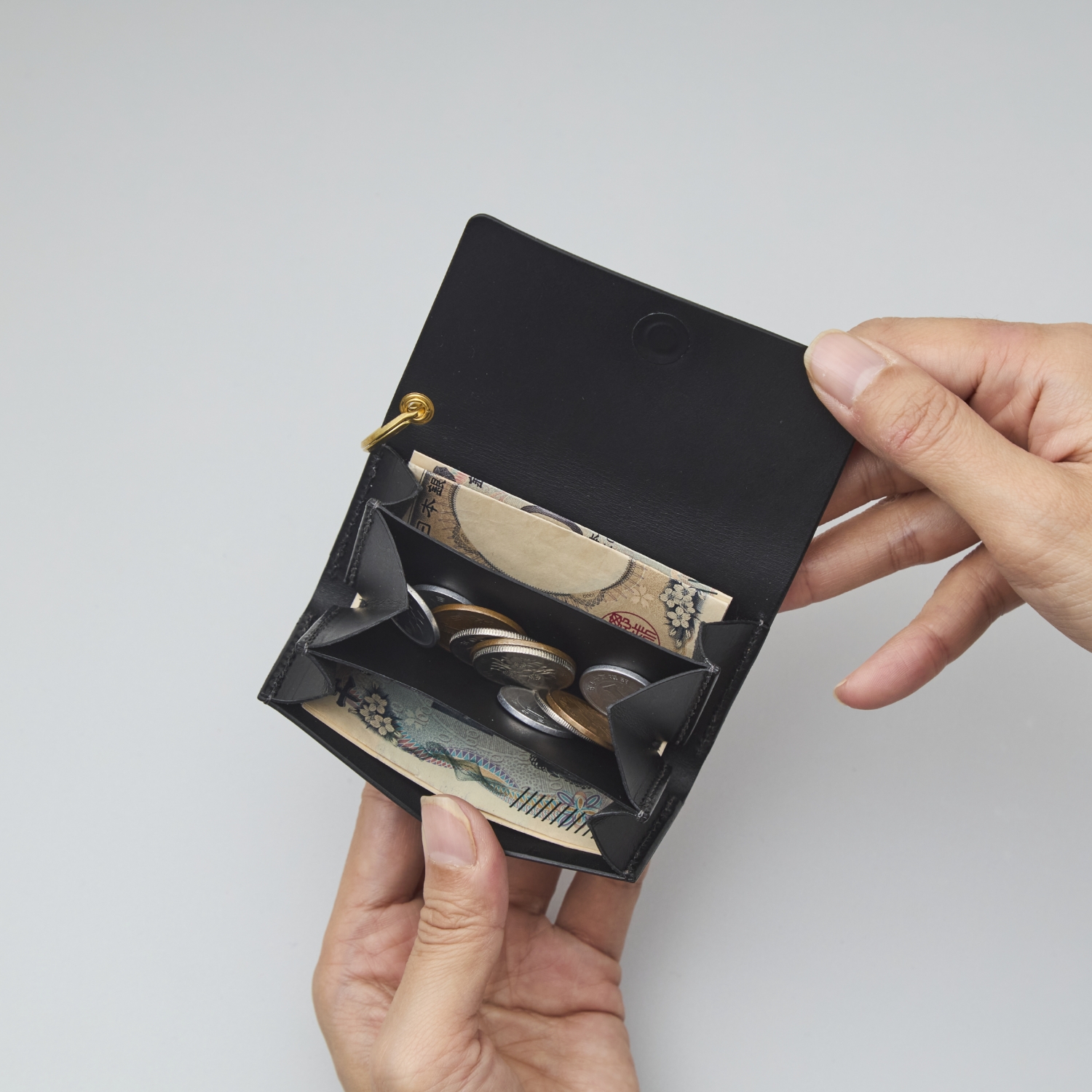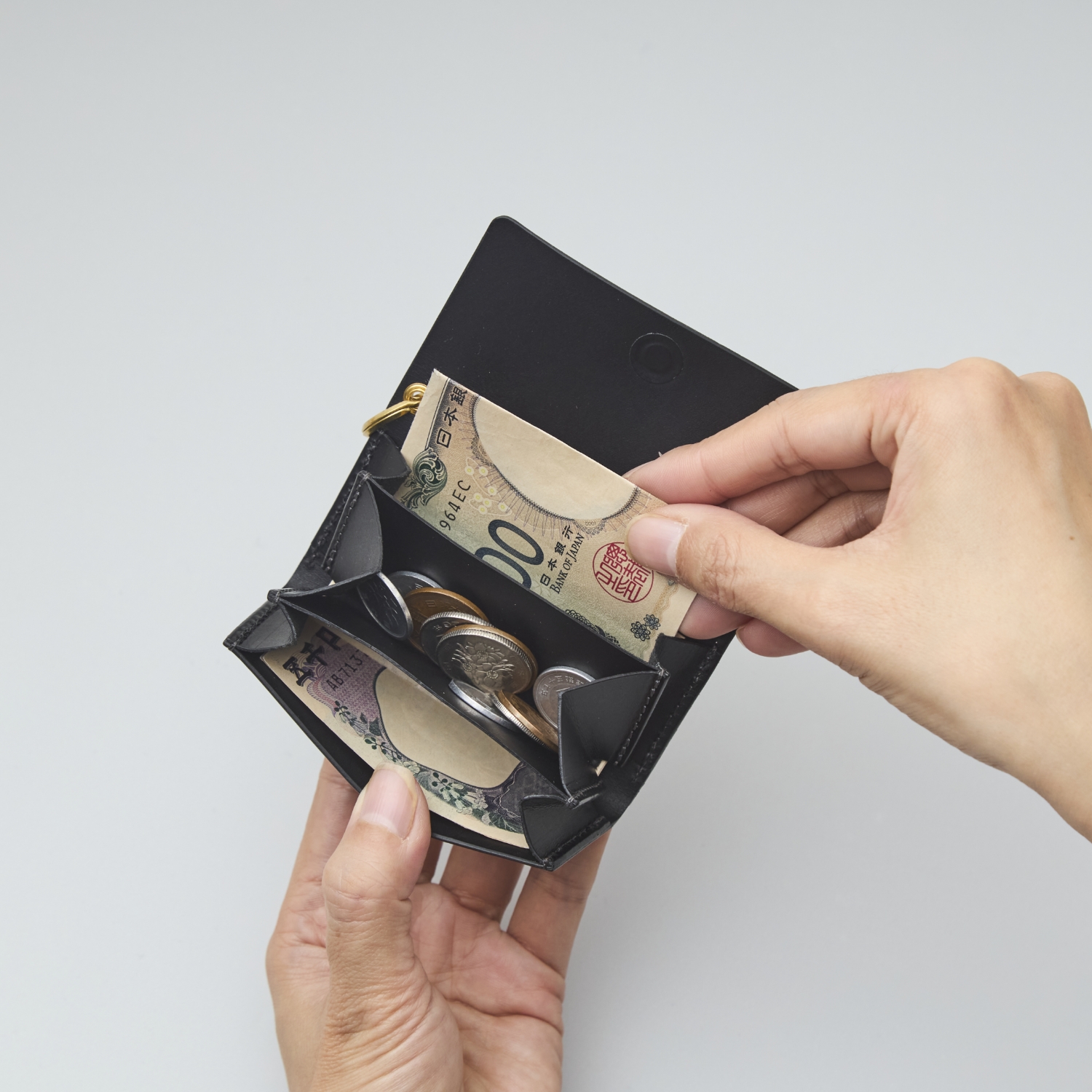 このキー付きミニ財布は、名刺とほぼ同じサイズ。そのコンパクトさでありながら、財布として必要最低限の機能を満たしています。それを可能にしたのは、札入れの仕様。二つ折りにしたお札を小銭入れの後ろからすべり込ませるようにして収納します(動画をご覧下さい)。