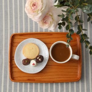 角だけでなく、4つの辺もふっくらとカーブしているような形をしています。直線がないからこそ、柔らかい雰囲気を醸し出せるのもこちらのトレーの魅力。食事を運んだあと、そのまま食卓に置いても、華やかな雰囲気を壊しません。もちろん一人のランチタイムやティータイムにも。トレーをマットのようにお使いいただけます。