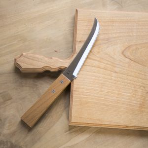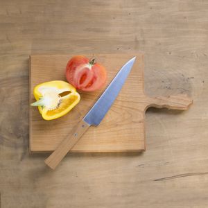 持ち手がケヤキの無垢材で、切れ味は本格的ながらテーブルの上でも絵になる佇まい。調理用の包丁は食卓で使うには正直見た目がイマイチですが、こちらはセンス良く決まるのが嬉しいポイントです。角ばった持ち手は一見シャープな印象ですが、緩やかなカーブラインと木の温もりがやさしさをプラス。シャープ過ぎない、絶妙な柔らかさのあるアイテムに仕上がりました。