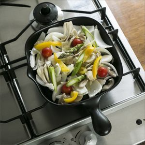 持ち手付きなので調理した後に移動させやすく、できたてをそのまま食卓へ出しても絵になります。本体と持ち手は一体成型仕上げで作られているので、つなぎ目がなく見た目が美しい上に丈夫です。