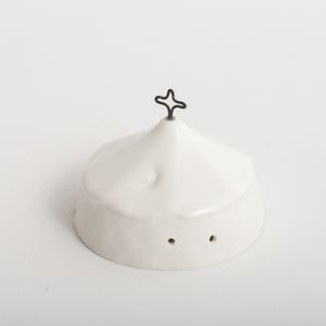 灯りのオブジェは透光性磁器でできているため、内側から照らすことでそれ自体が照明のシェードようにぼんやり光ります。