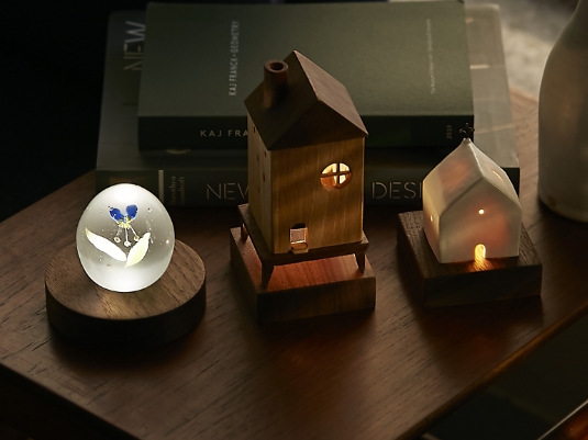 オブジェを上にのせることで自分だけの常夜灯を作ることができ、照明として使わない時もシンプルな無垢材の台座に見えるのが最大のポイント。オブジェを引き立ててインテリアに馴染みます。