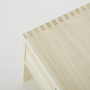 こちらのスツールは木材の中で最も軽い部類に入る桐材を使っています。そのためSサイズでは2000g、Mサイズでは2500gという軽さ。他の引き出し付きスツールと比較すると500〜1000gほど軽く作られています。