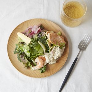 丸皿は食パン1枚を載せるのにちょうど良いサイズ。直径は約20cmあるので、手前にサンドウィッチやトースト半分くらいのサイズのパン、奥にサラダや果物など2−3品をのせるのにもぴったりな大きさです。